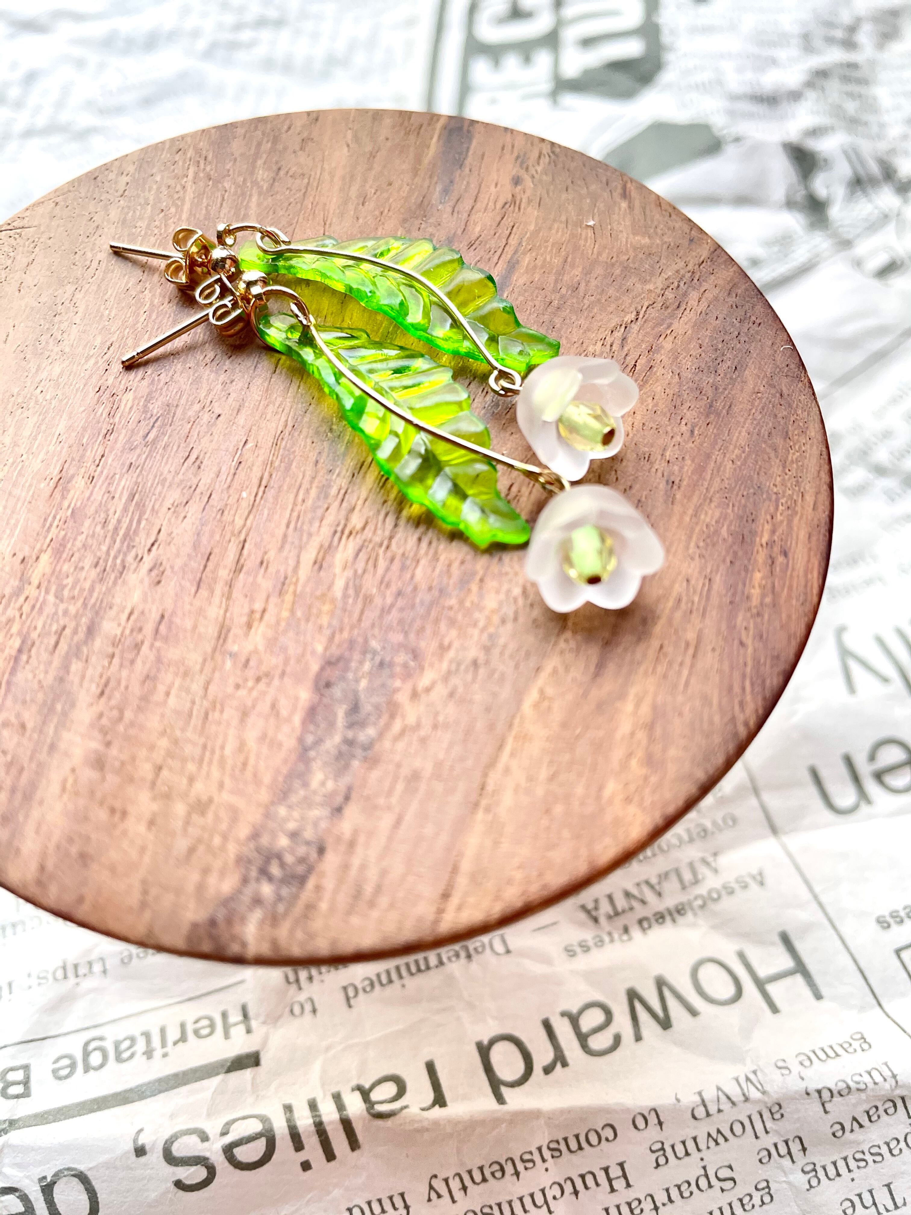 すりガラスのようなホワイトのすずらんイヤーアクセサリー。ピアスとイヤリングはオプションにてお願い致します。