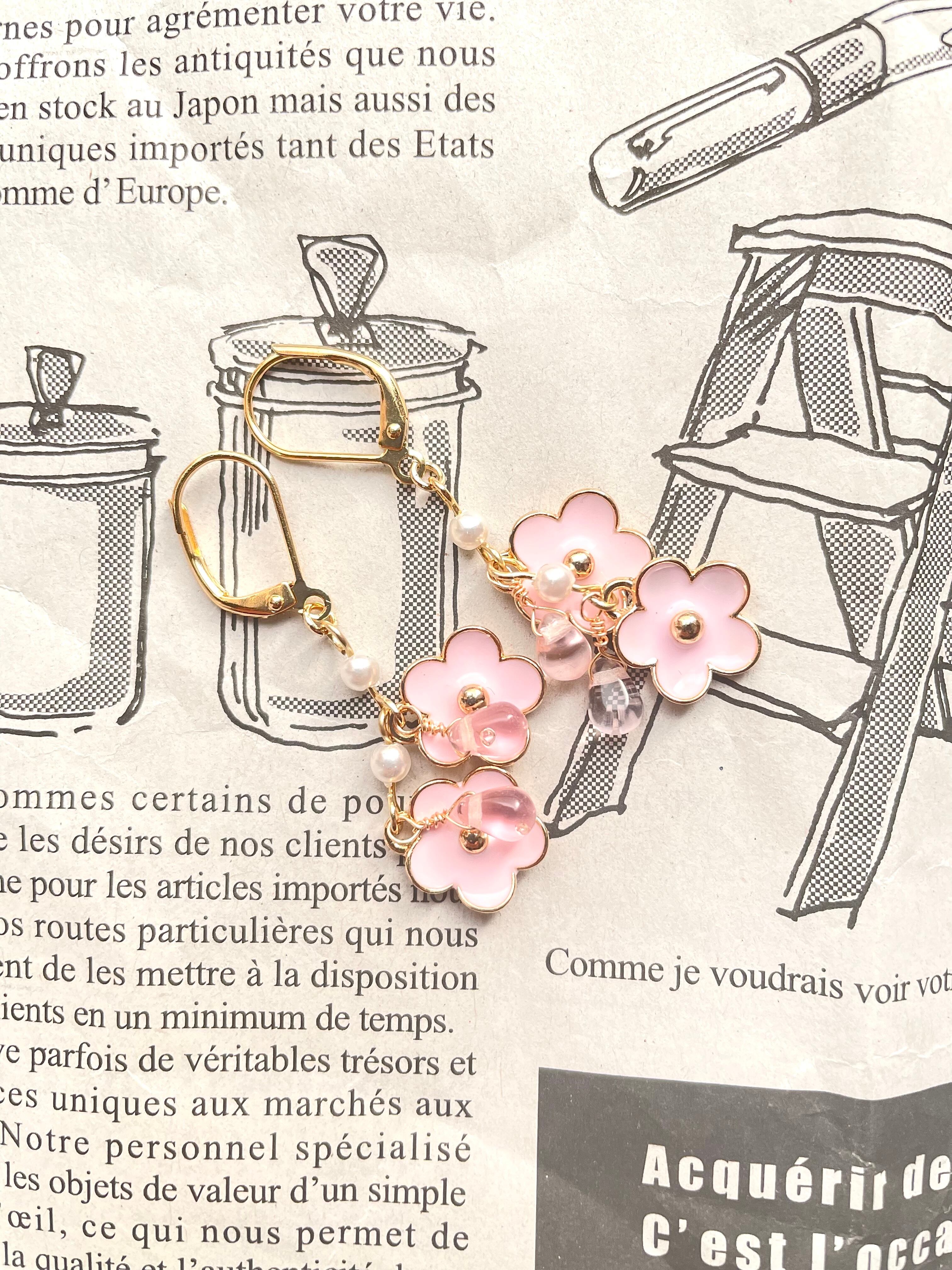 流れる川のそばで見た、古木のしだれ桜はピンクの花やツボミを揺らしながら、可愛らしく咲いていました。親子連れで花を楽しむ景色から、親子でペアのイヤーアクセサリー。