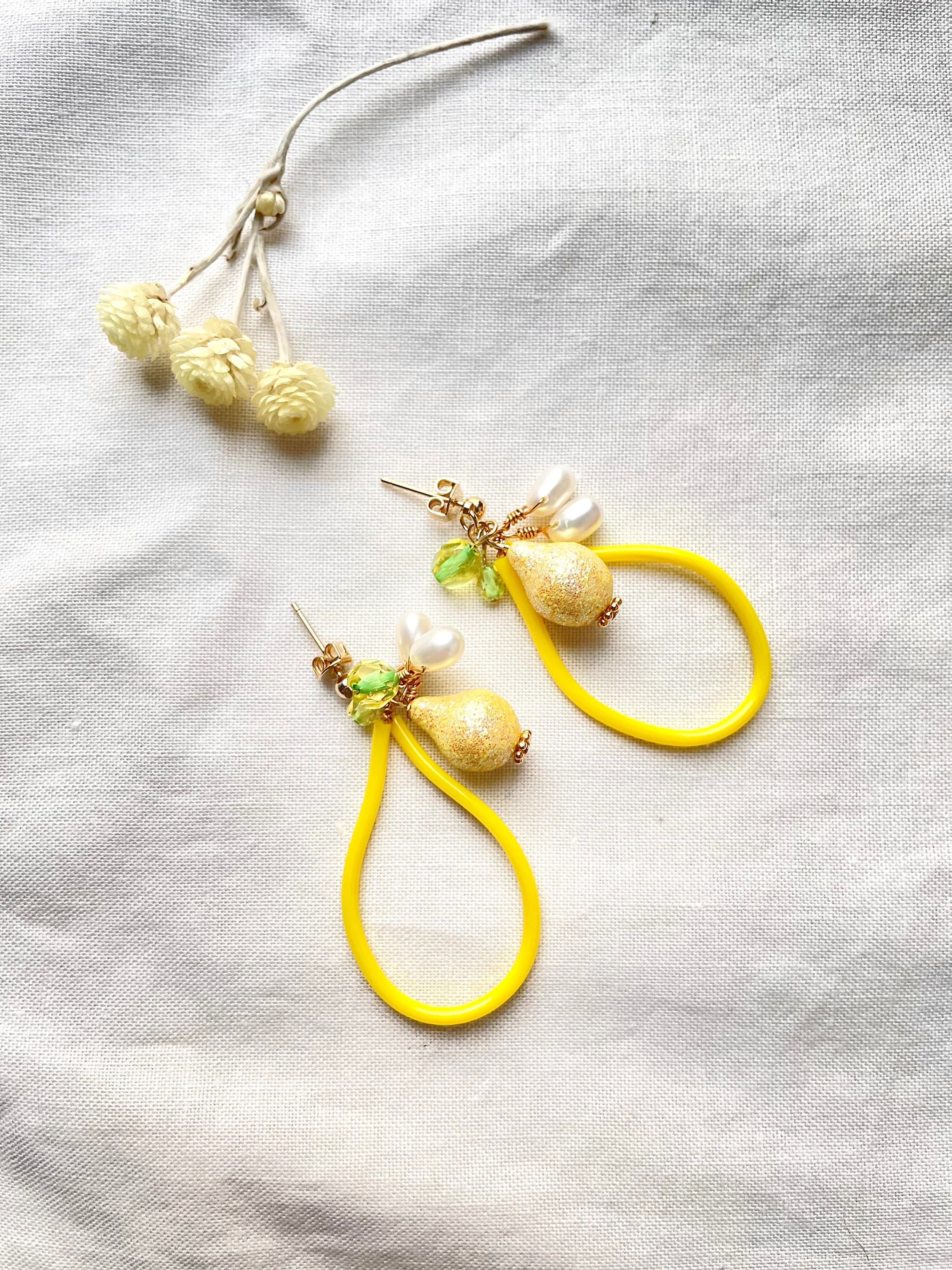 オーロラにきらめくレモンのような洋梨のような、イタリアンヴィンテージと透かしがキレイなグリーンのフランスビーズ、淡水パールのクレオビーズのピアスです。