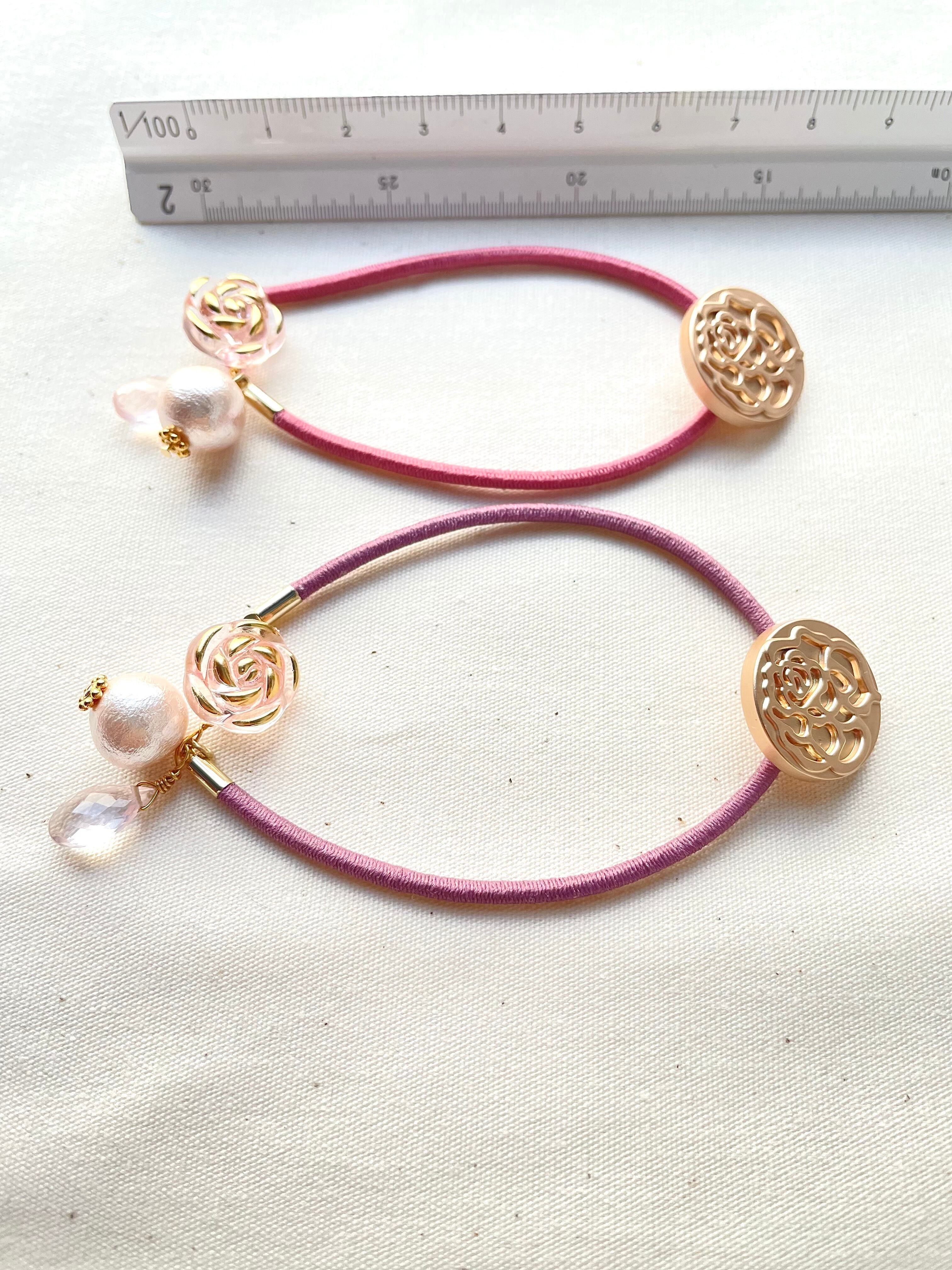 バラの名前にもなっている著名な音楽家のご夫婦から、バラをモチーフにしたレリーフのようなボタンとゴールドで縁取られたアクリルボタンにローズクオーツと、コットンパールをプラスした優しいメロディが聴こえて来そうな、ヘアアクセサリーです。ブレスレットとしても違和感の無いデザイン。