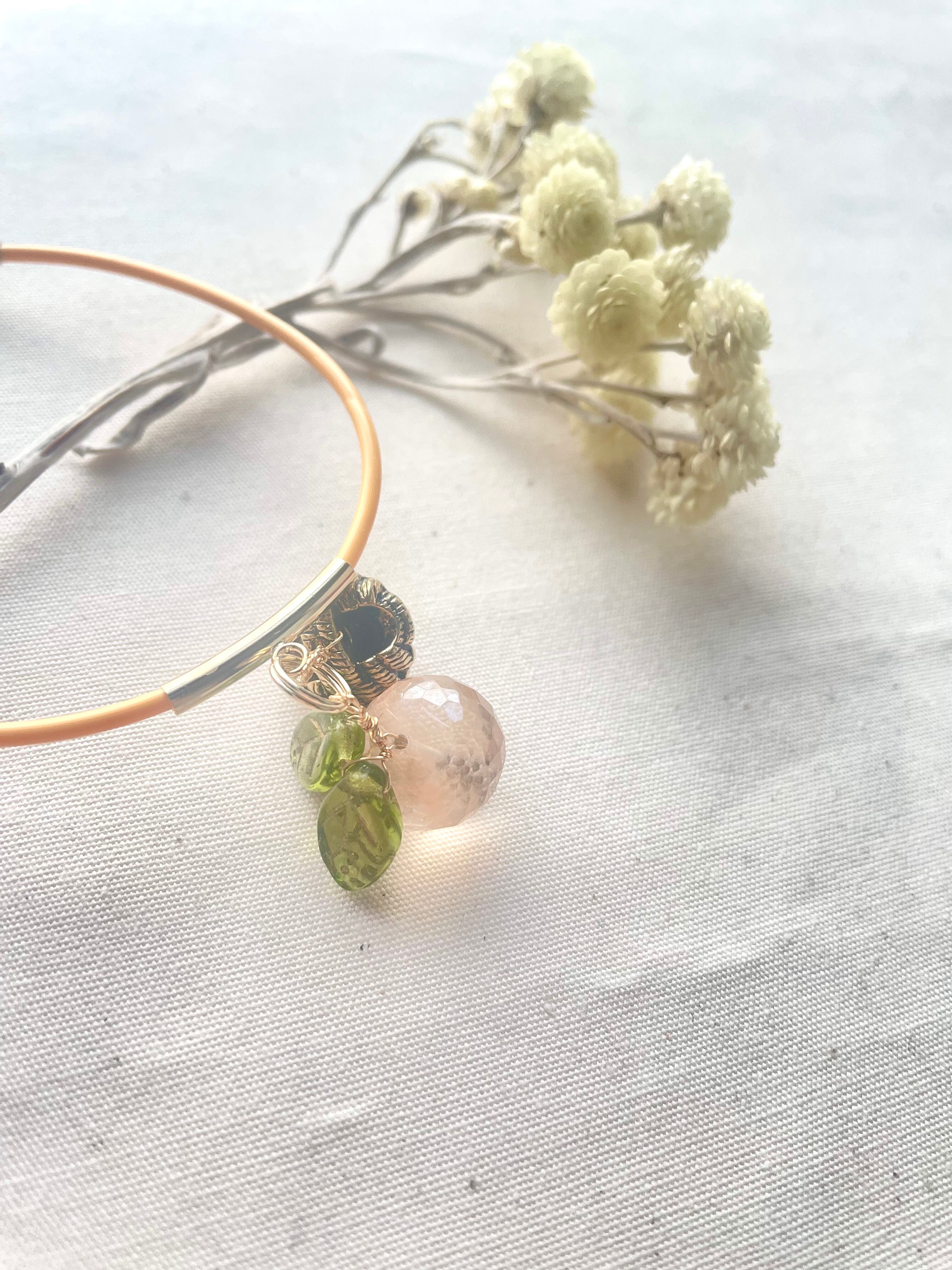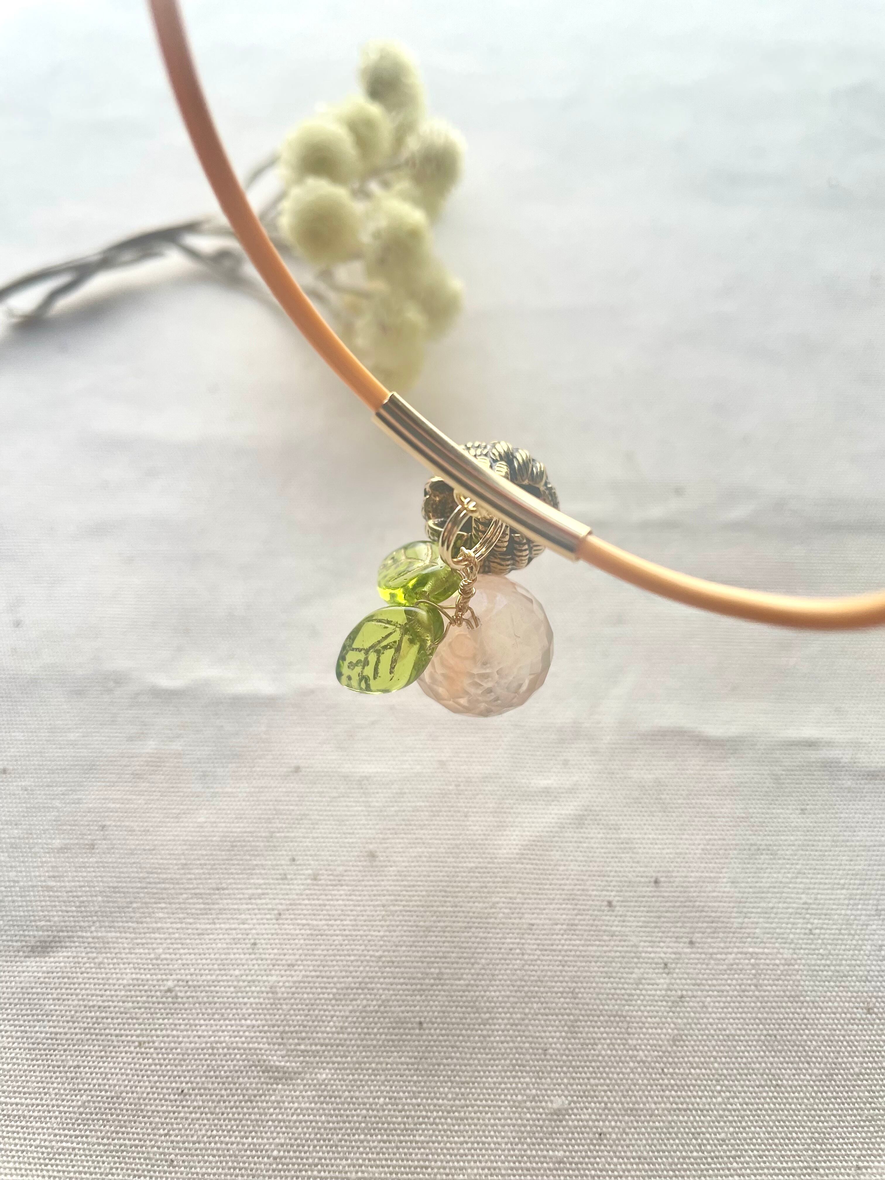 Panier à orange(パニエアオランジュ)は、タンジェリンクオーツのオレンジカラーが特徴的なワイヤーブレスレットです。グリーンの葉は、チェコのガラスビーズ、バスケットを思わせるようなヴィンテージビーズはその形状も独特でとても美しい一品です。