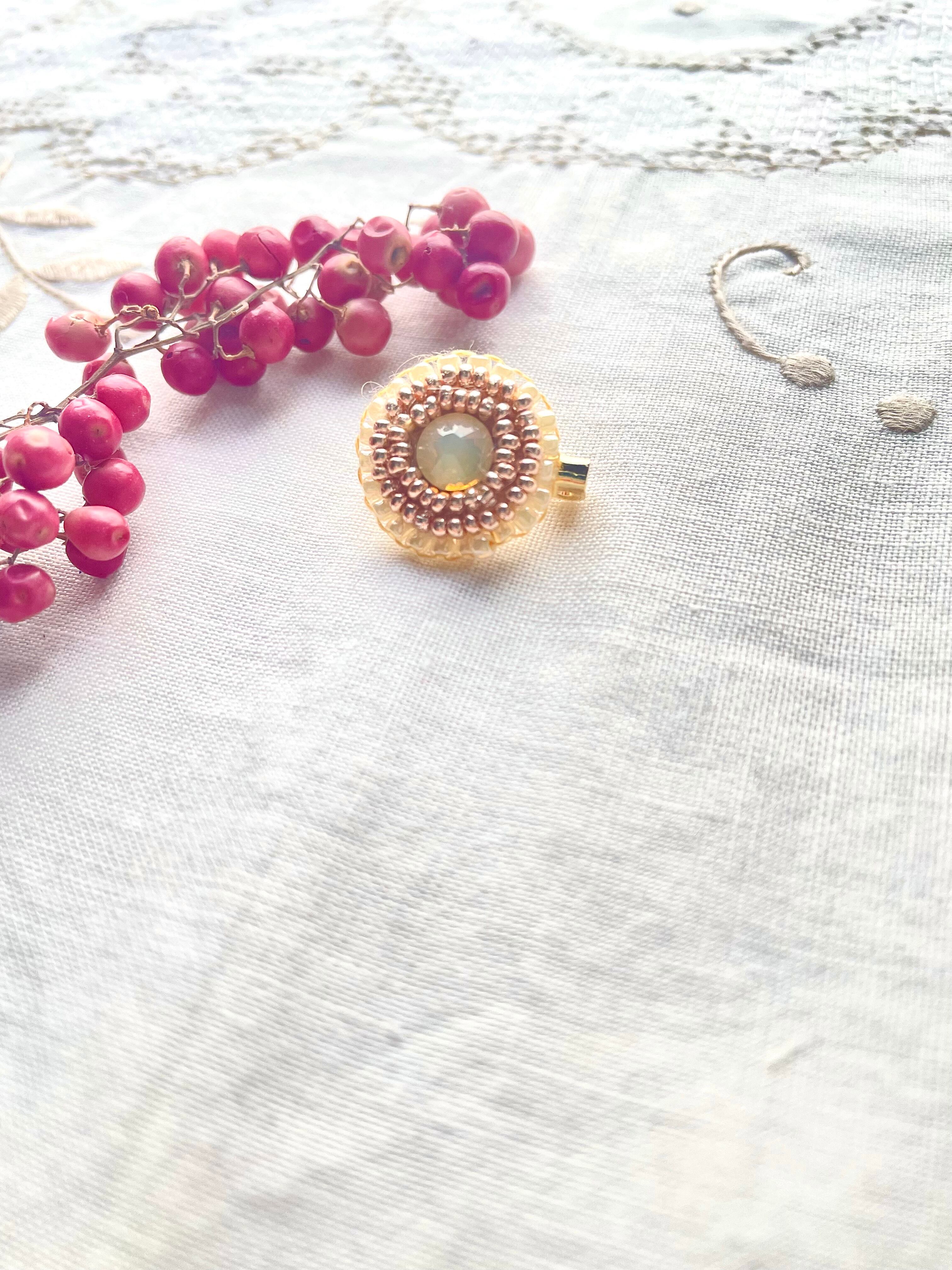 ミルキーなフランス素材のカボションをビーズで囲んだブローチです。
