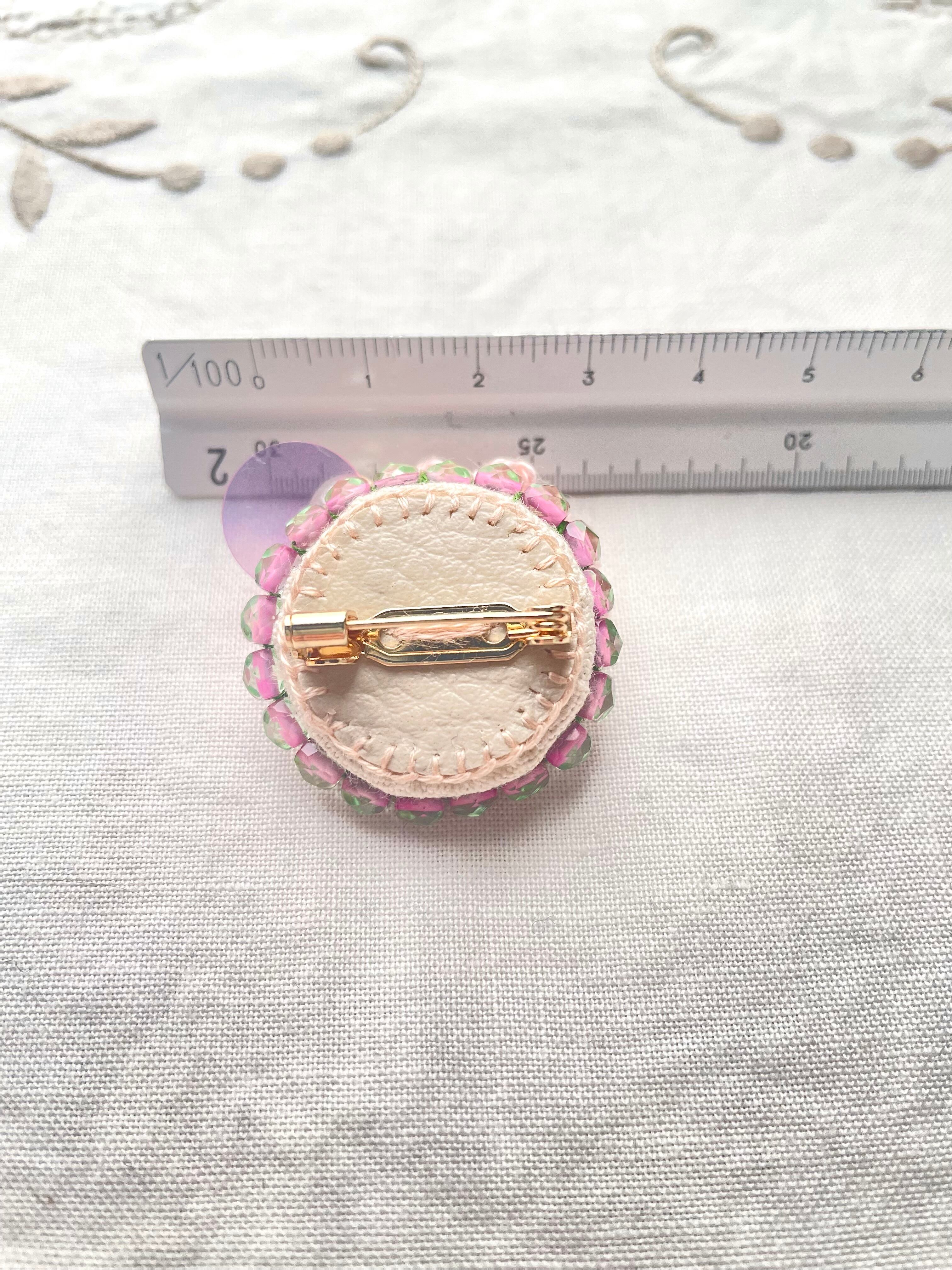 刺繍糸で編んだ桜色の花は立体的に、周りを飾るのはフランスビーズ。